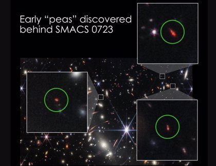 En julio de 2022, la NASA y sus socios en la misión Webb lanzaron la imagen infrarroja más profunda y nítida del universo distante jamás vista, capturando miles de galaxias dentro y detrás de un cúmulo conocido como SMACS 0723. La masa del cúmulo lo convierte en una lente gravitacional, que magnifica y distorsiona la apariencia de las galaxias de fondo. Entre las galaxias más débiles detrás del cúmulo había un trío de objetos infrarrojos compactos que parecían ser parientes lejanos de los guisantes verdes. La más distante de estas tres galaxias se amplió unas 10 veces, proporcionando una ayuda significativa de la naturaleza además de las capacidades sin precedentes del telescopio.