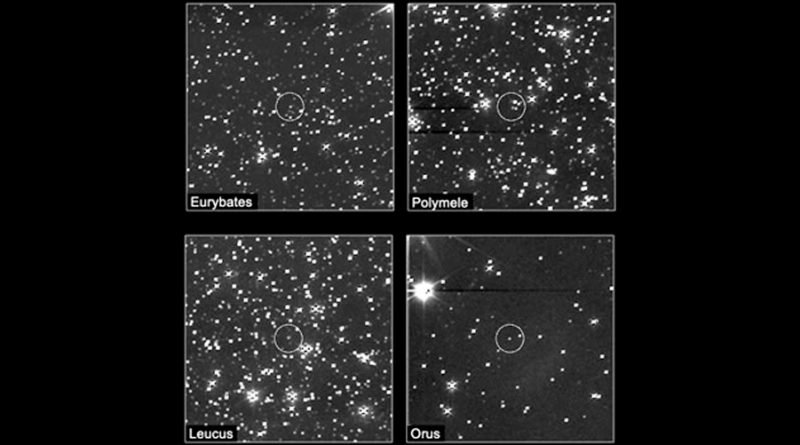 Del 25 al 27 de Marzo de 2023, Lucy usó su generador de imágenes de mayor resolución, L’LORRI, para capturar sus primeras vistas de cuatro asteroides troyanos de Júpiter. De izquierda a derecha en la imagen son: Eurybates, Polymele, Leucus y Orus.